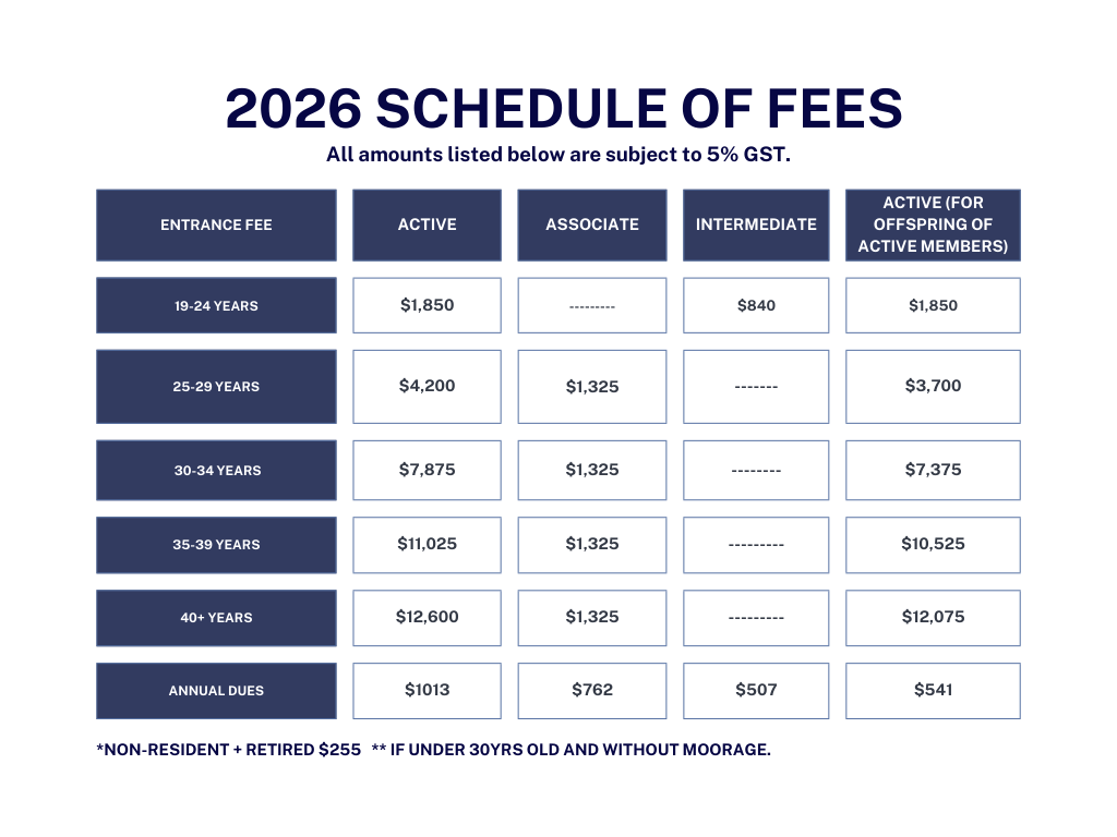 Active members are 19 years of age or older and are entitled to vote, hold office, have moorage space for one yacht, and storage space for one tender, one dingy, and two eco-boats. Active members are also entitled to participate in social events, and share in the distribution of assets upon dissolution. Seniority is determined by membership number.