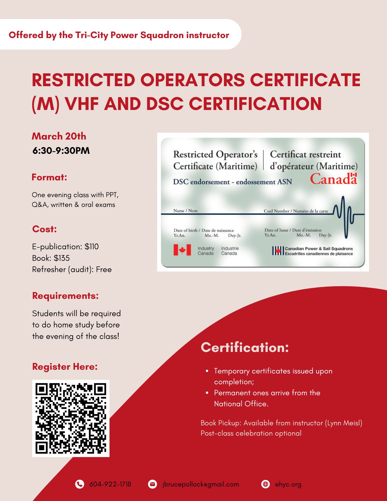 NANCY MITCHELL 2025-02-28 NANCY MITCHELL 2025-02-28 Restricted Operators (Marine) Certificate: VHF & DSC Certification. Read More