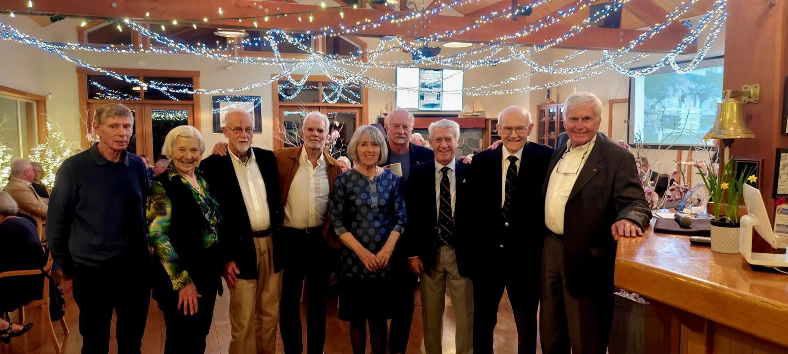 During our dinner, there was much discussion about the clubhouse's construction, particularly from those who had been involved. Several members asked if we could hear from some of those participants. Bruce kindly introduced me to lead this discussion. After a brief introduction I invited Al Lill, a former Commodore instrumental in initiating and navigating the project through the District of West Vancouver, to share his recollections. He recounted some challenges they faced but also their unwavering determination to succeed, explaining that continuing was essential due to the lower floors flooding during spring high tides. We then heard from Tom Bowen, the project architect. He shared some of the challenges encountered, such as waiting for inspectors who were sometimes found asleep in the parking lot. As an artist, Tom fondly remembered the pleasing patina developing on the fir floors. However, after several weddings with dancing in stiletto heels, he questioned whether there was a limit to the patina's development. Chester Spink then spoke about spending a week wheeling barrow loads of rocks to fill a hole. He mentioned that, as volunteers, not everyone consistently adhered to safety regulations. However, one morning, upon seeing a worker fully equipped with a hard hat, eye protection, and high-visibility vest, he commended the individual for setting a positive example, contrasting it with the behavior of most other workers. It turned out that this exemplary worker was from WorkSafeBC!